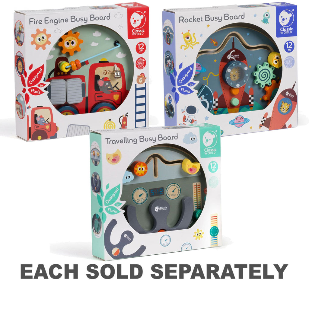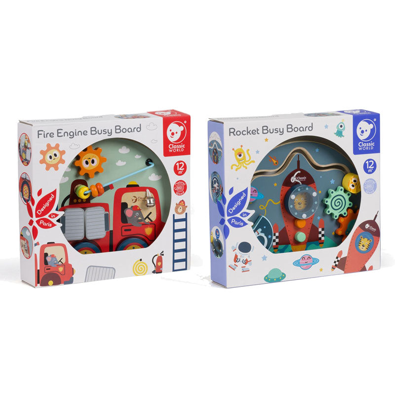 Spark your child's curiosity with the Classic World Busy Board -- Fire Engine -- an engaging, activity-packed board designed to support sensory exploration and fine motor development for children aged 12 months and up.Featuring a bright red fire truck and a host of built-in play elements, this busy board is perfect for little hands eager to explore. From gears and turning wheels to a working bell, each feature encourages cause-and-effect learning and coordination. There's even a surprise behind the small doors to add an extra touch of discovery!Fuel Imagination & Early Skills